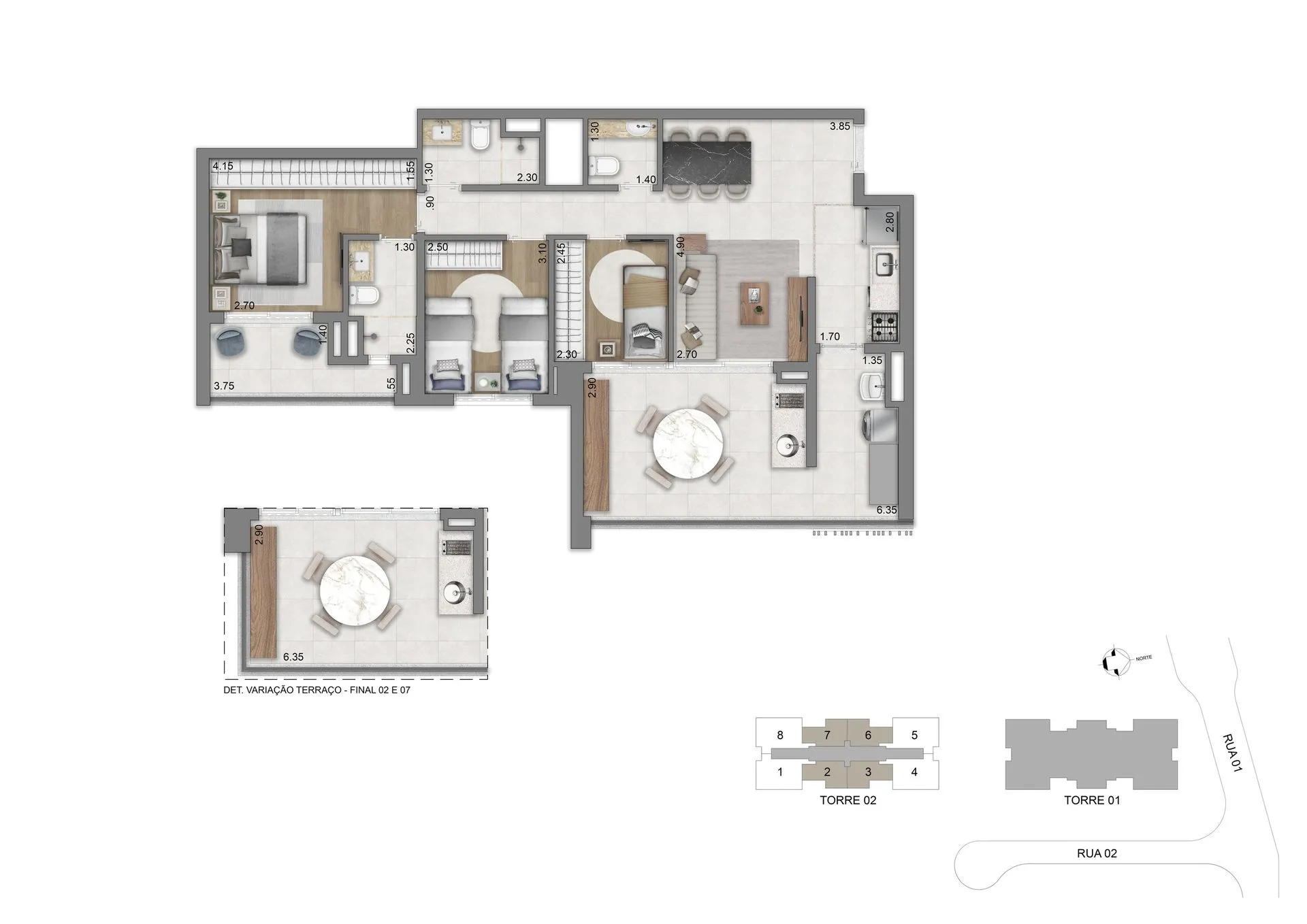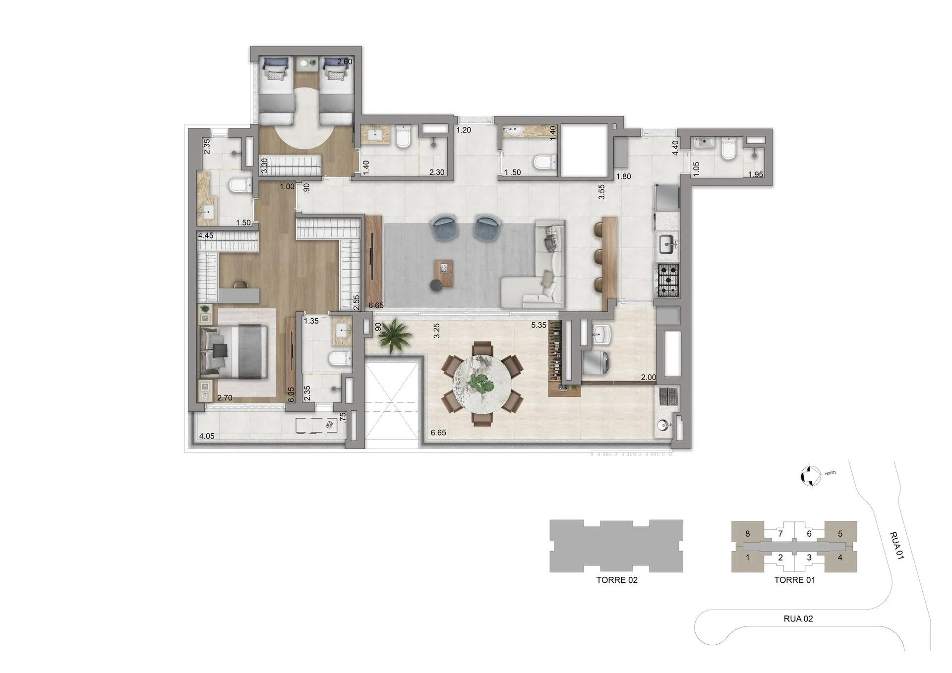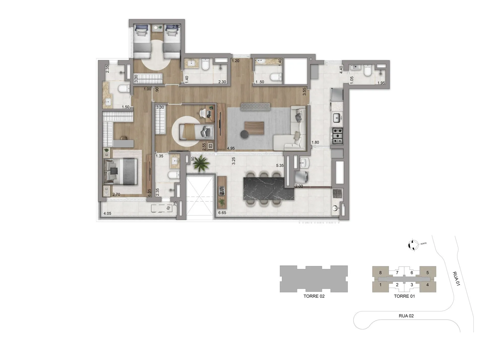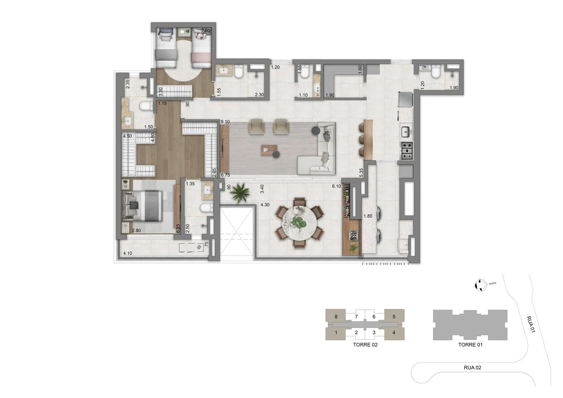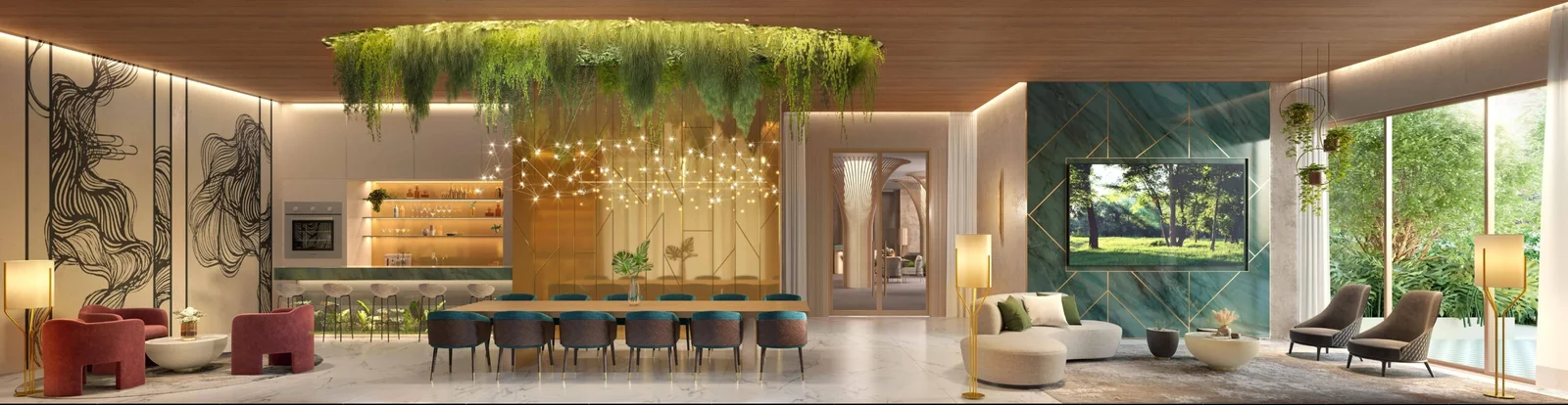 As residências apresentam plantas de 77 m², 94 m², 123 m² e 134 m², com 2 ou 3 suítes e 2 vagas de garagem, além de unidades duplex que chegam a aproximadamente 247 m² e 270 m². Os espaços foram pensados para oferecer amplitude, privacidade e conexão direta com o verde, com layouts flexíveis, terraços generosos, abundante iluminação natural e infraestrutura para automação, ar-condicionado e alto desempenho acústico e térmico.