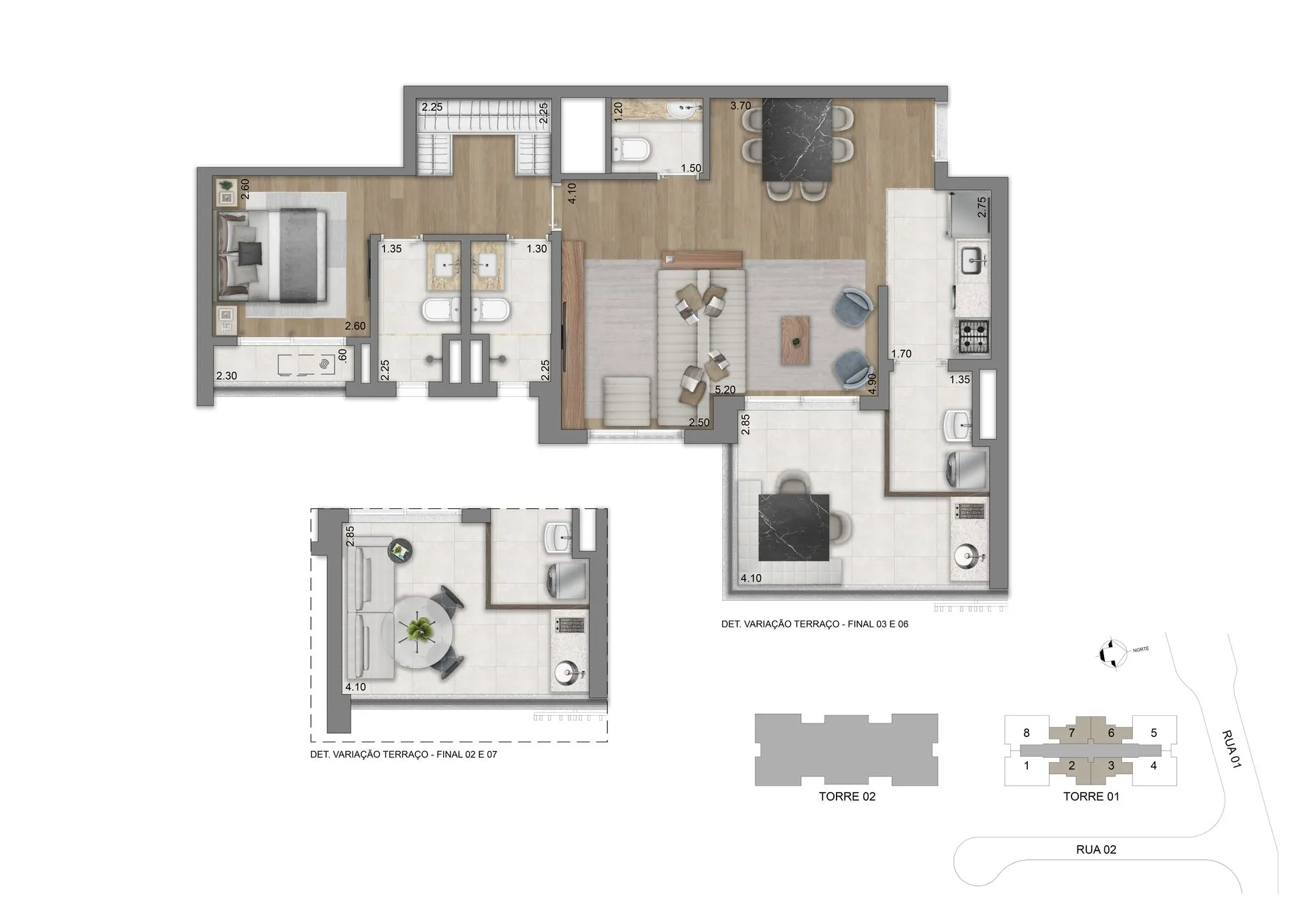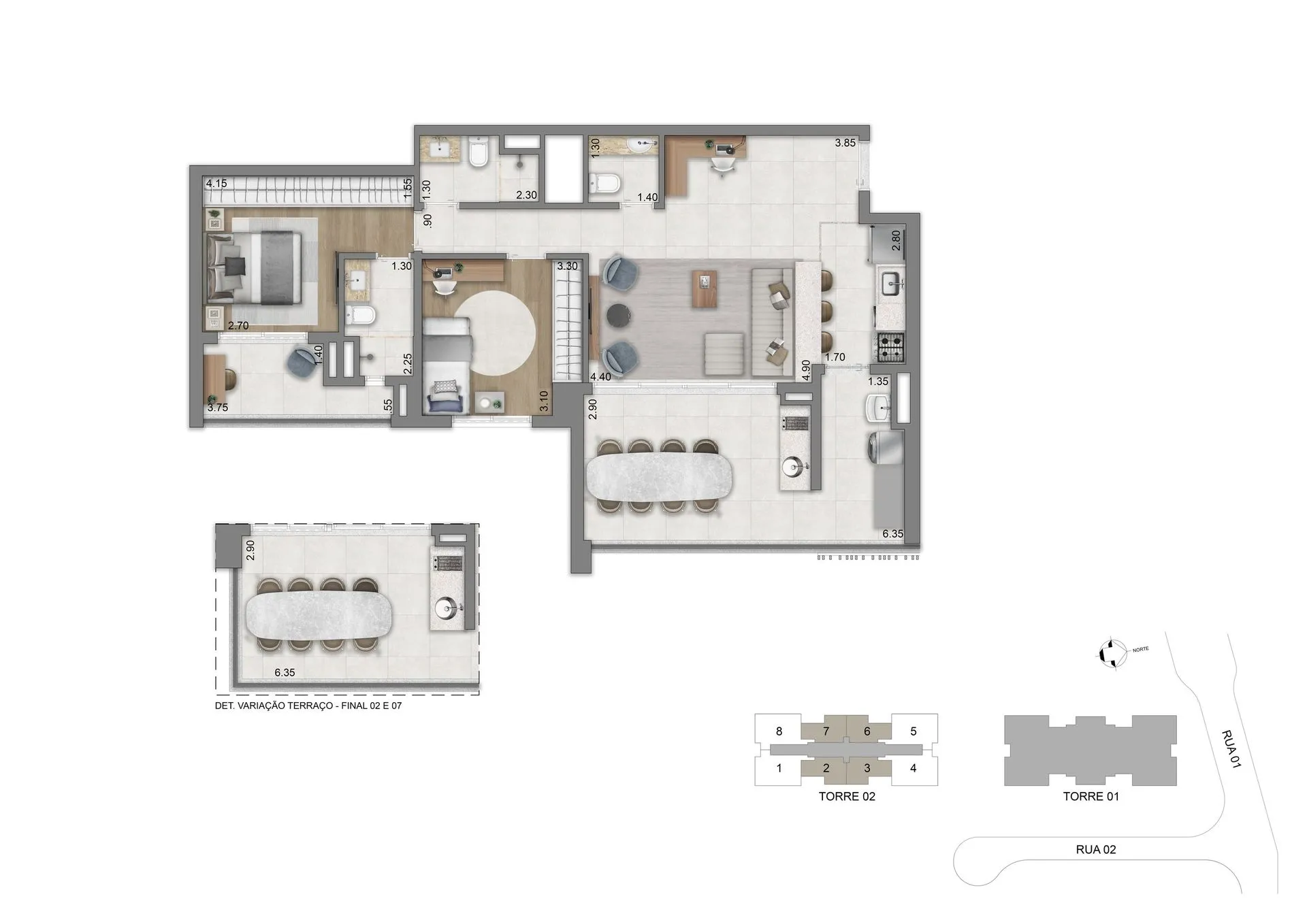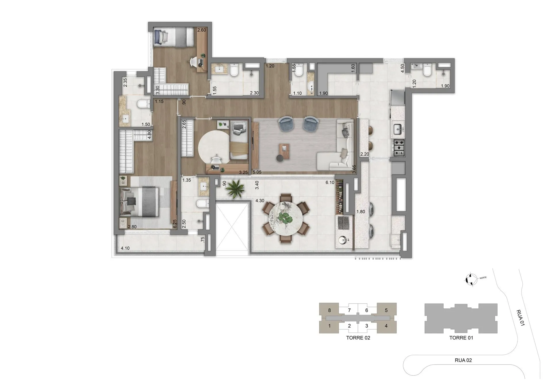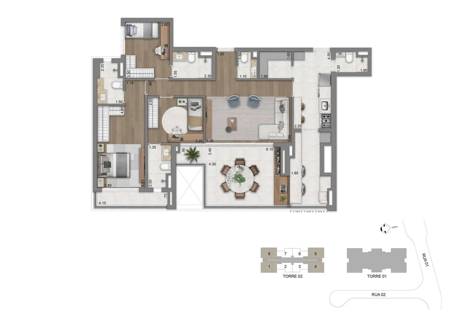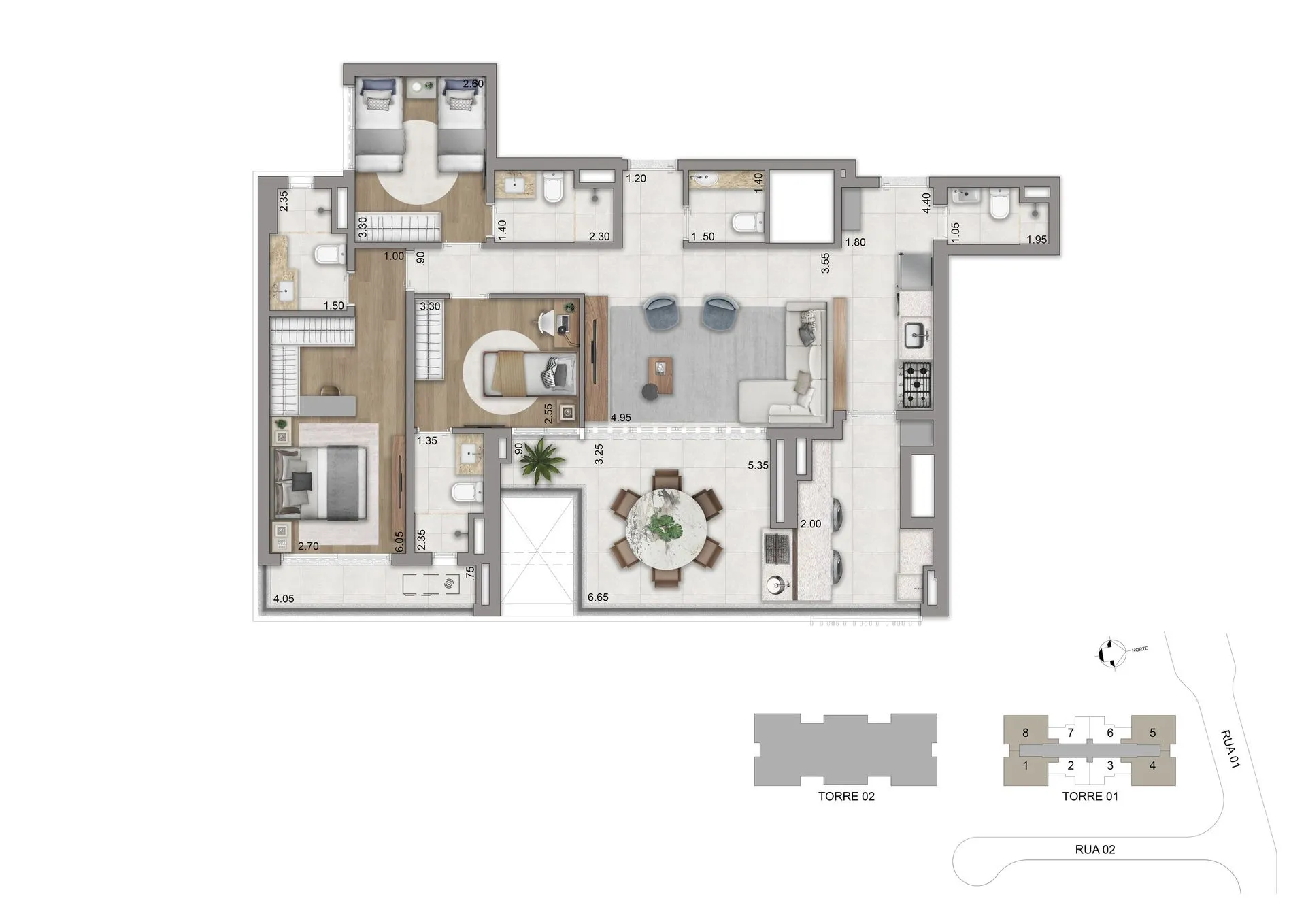 As residências apresentam plantas de 77 m², 94 m², 123 m² e 134 m², com 2 ou 3 suítes e 2 vagas de garagem, além de unidades duplex que chegam a aproximadamente 247 m² e 270 m². Os espaços foram pensados para oferecer amplitude, privacidade e conexão direta com o verde, com layouts flexíveis, terraços generosos, abundante iluminação natural e infraestrutura para automação, ar-condicionado e alto desempenho acústico e térmico.