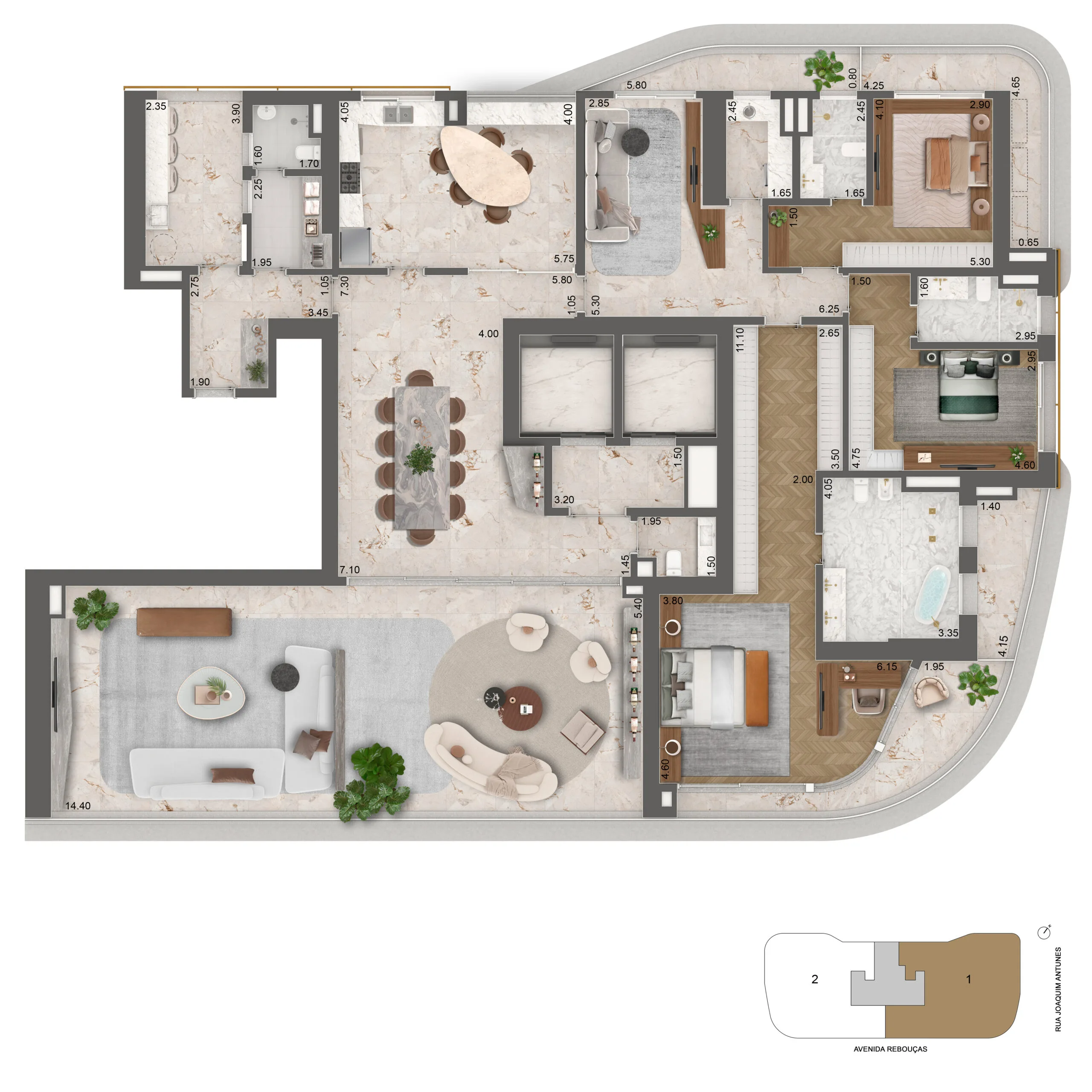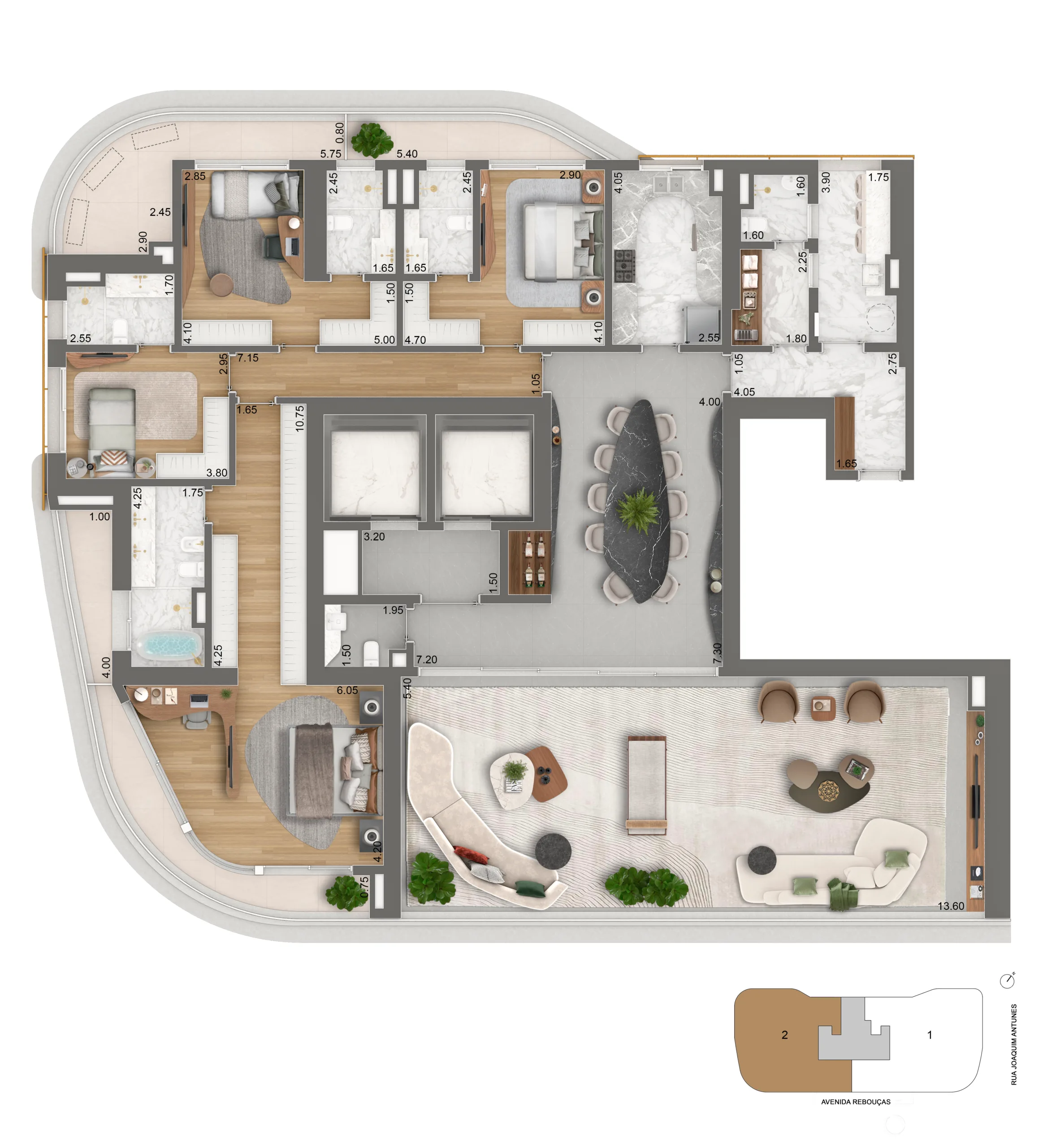 Os apartamentos, com metragens de 339 m² a 637 m², oferecem hall privativo, plantas flexíveis, terraços generosos, ampla iluminação natural e vistas permanentes para o Jardim Europa. As coberturas duplex elevam ainda mais o padrão, com espaços integrados, acabamentos sofisticados, quatro suítes e até seis vagas de garagem, traduzindo exclusividade em cada detalhe.
