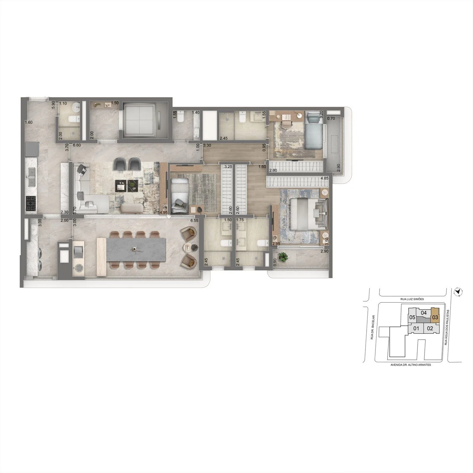 Principais informações de planta: Unidades residenciais com metragem privativa de 110 a 180 m², atendendo a diferentes perfis de moradia. Configurações com 1 a 4 dormitórios, incluindo opções com 1 a 3 suítes. Todas as unidades contam com 2 vagas de garagem.