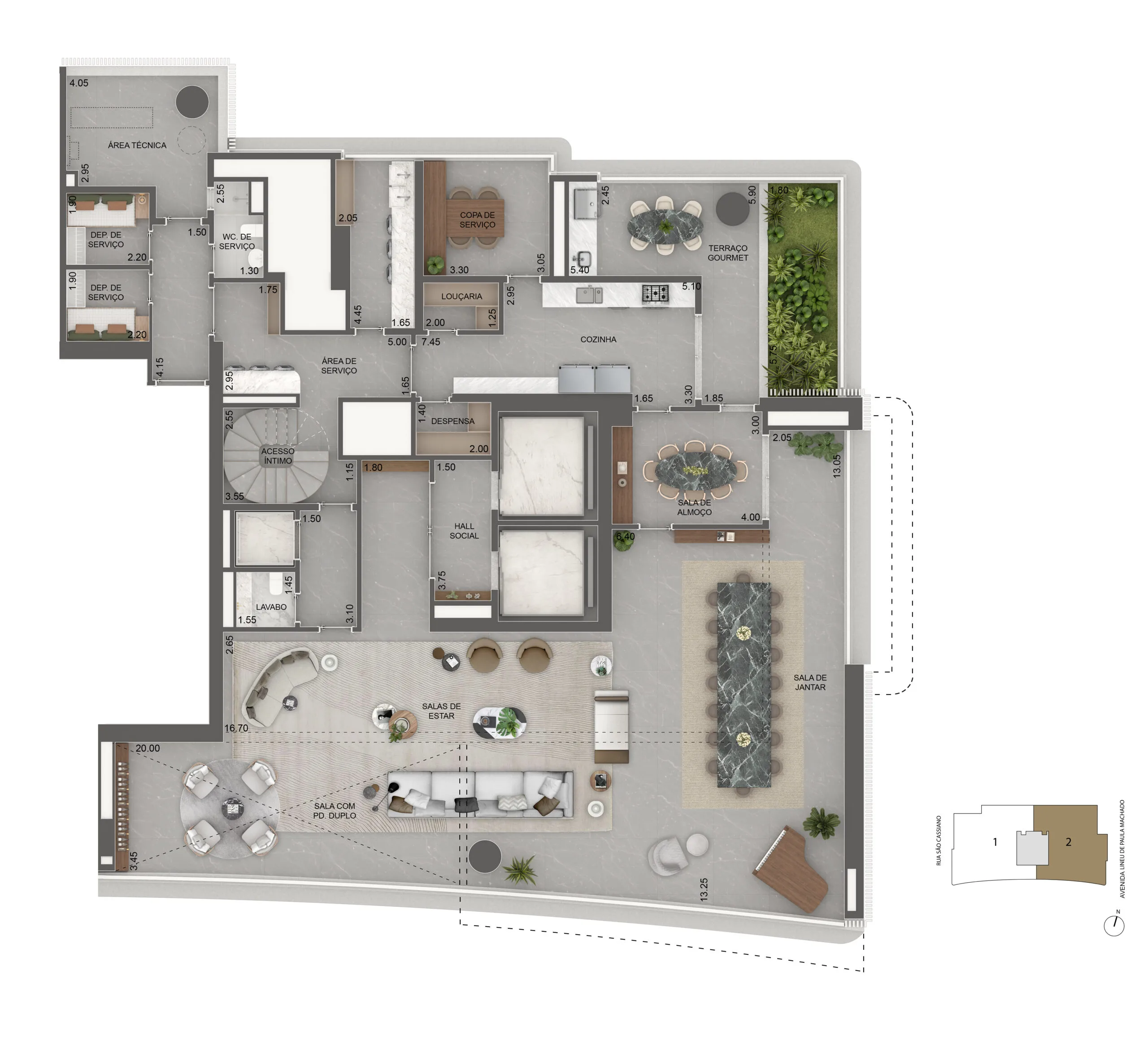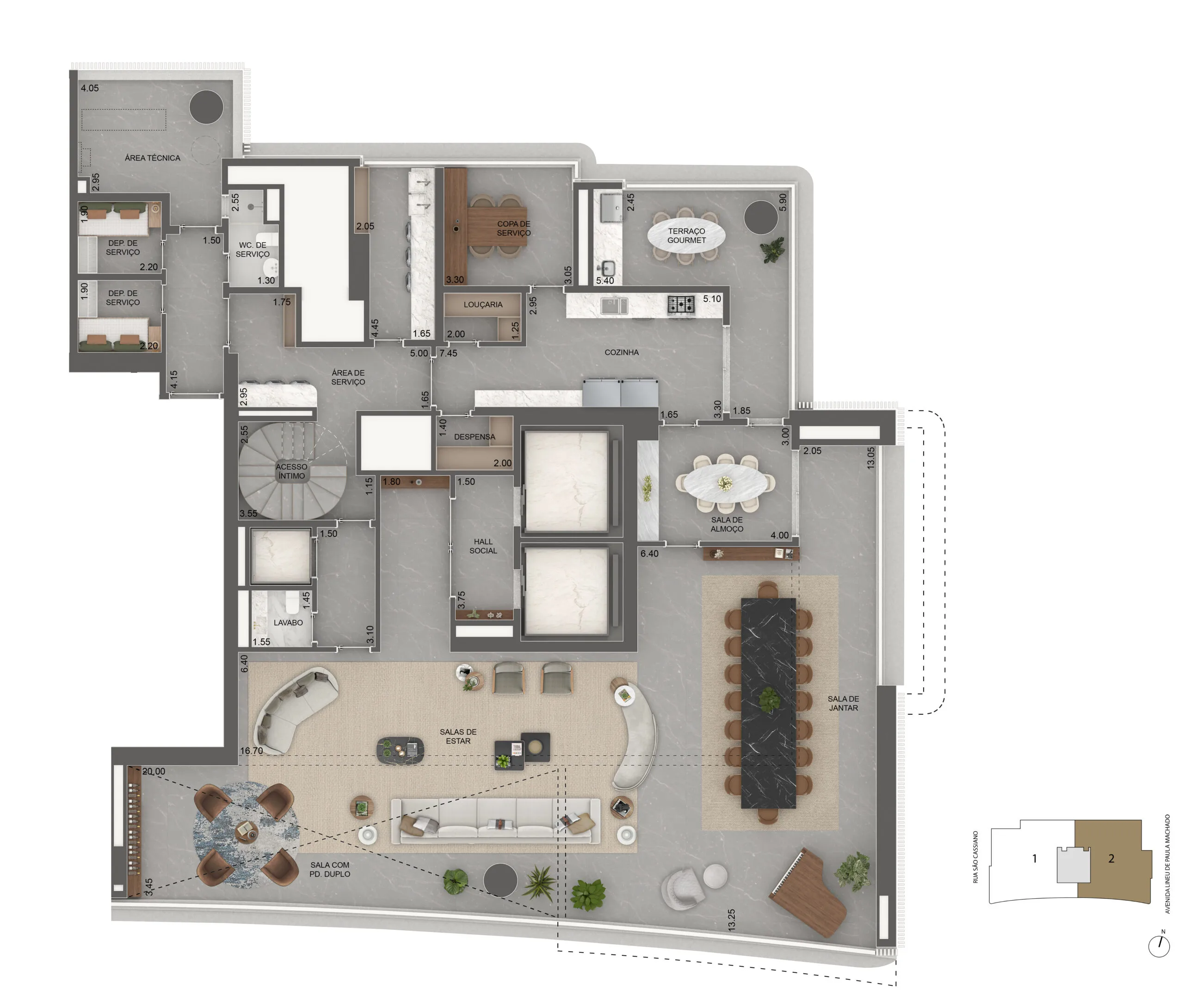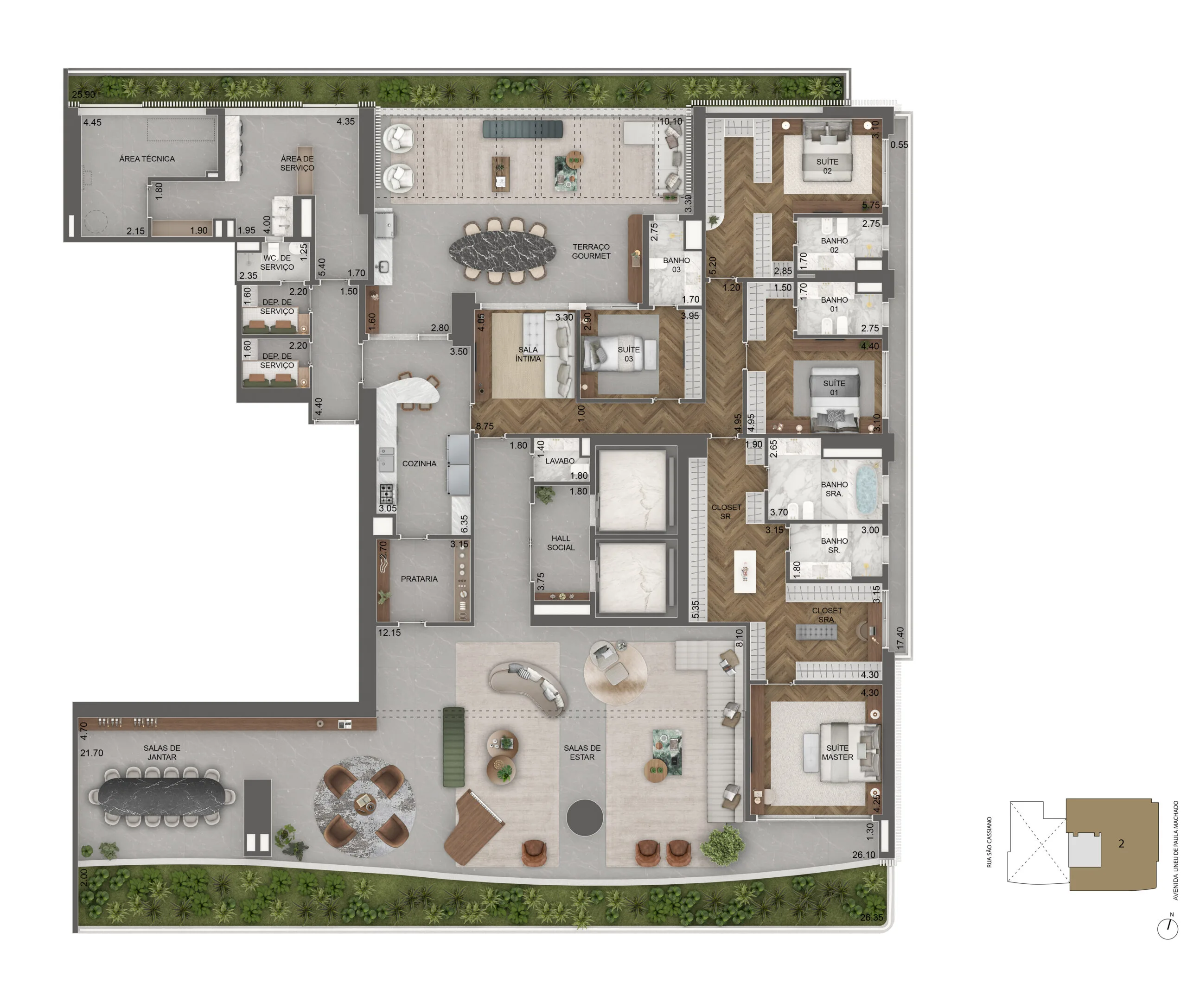 As residências oferecem metragens amplas que variam de 465 m² a 884 m², com quatro suítes e quatro a seis vagas de garagem, em plantas que privilegiam amplitude, conforto e privacidade. Um lançamento residencial que traduz o máximo do design italiano e do morar de alto padrão em São Paulo.