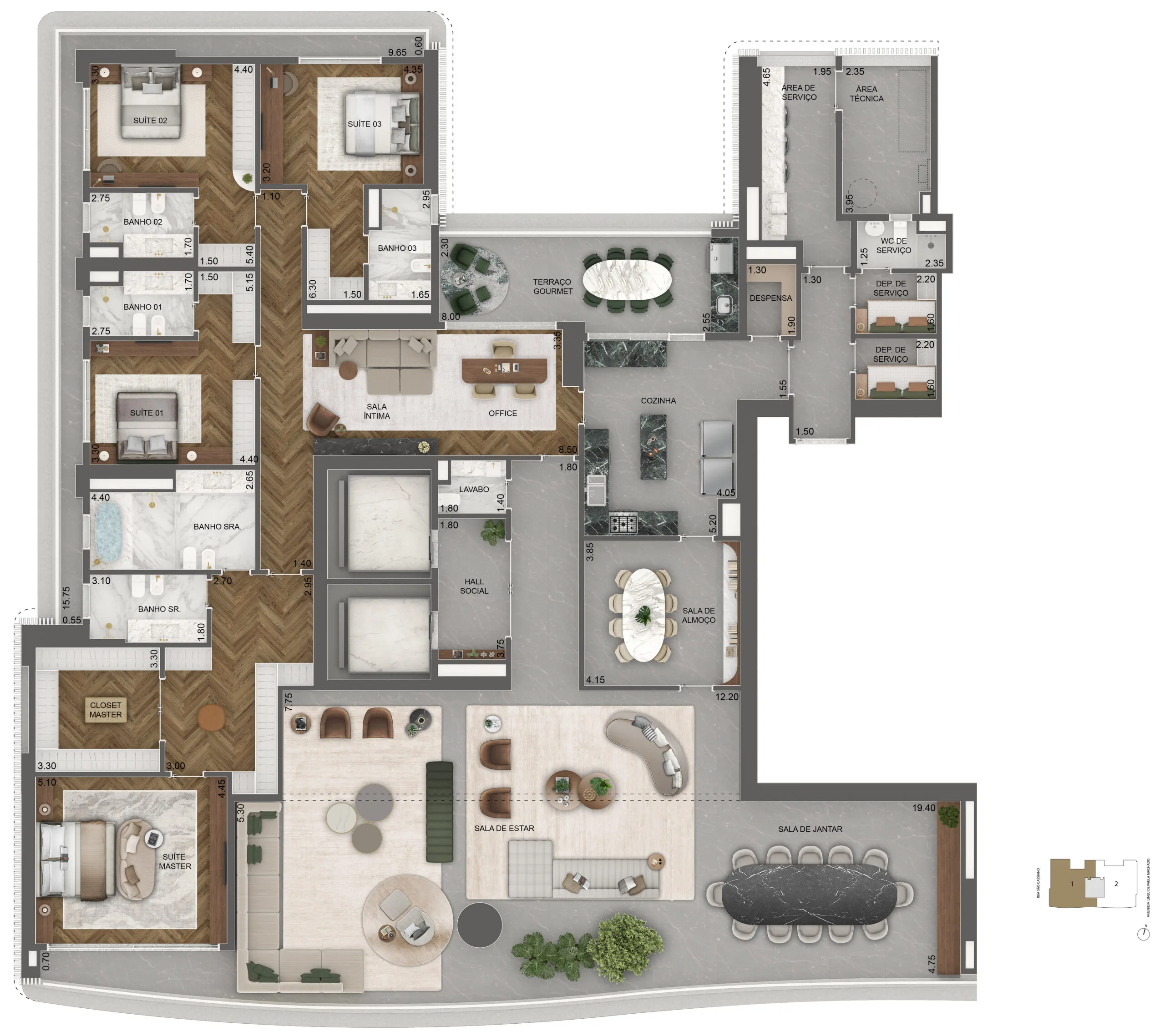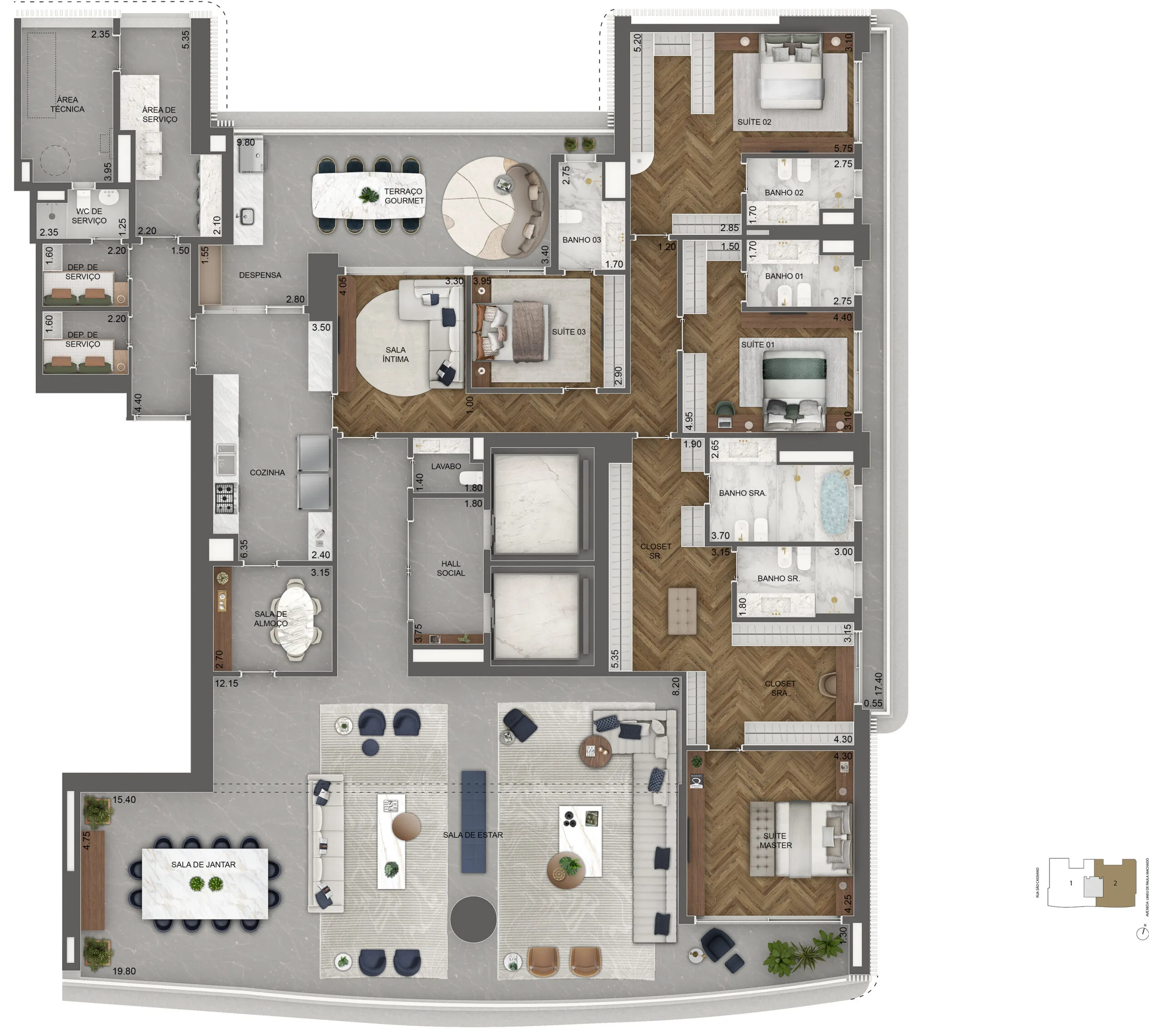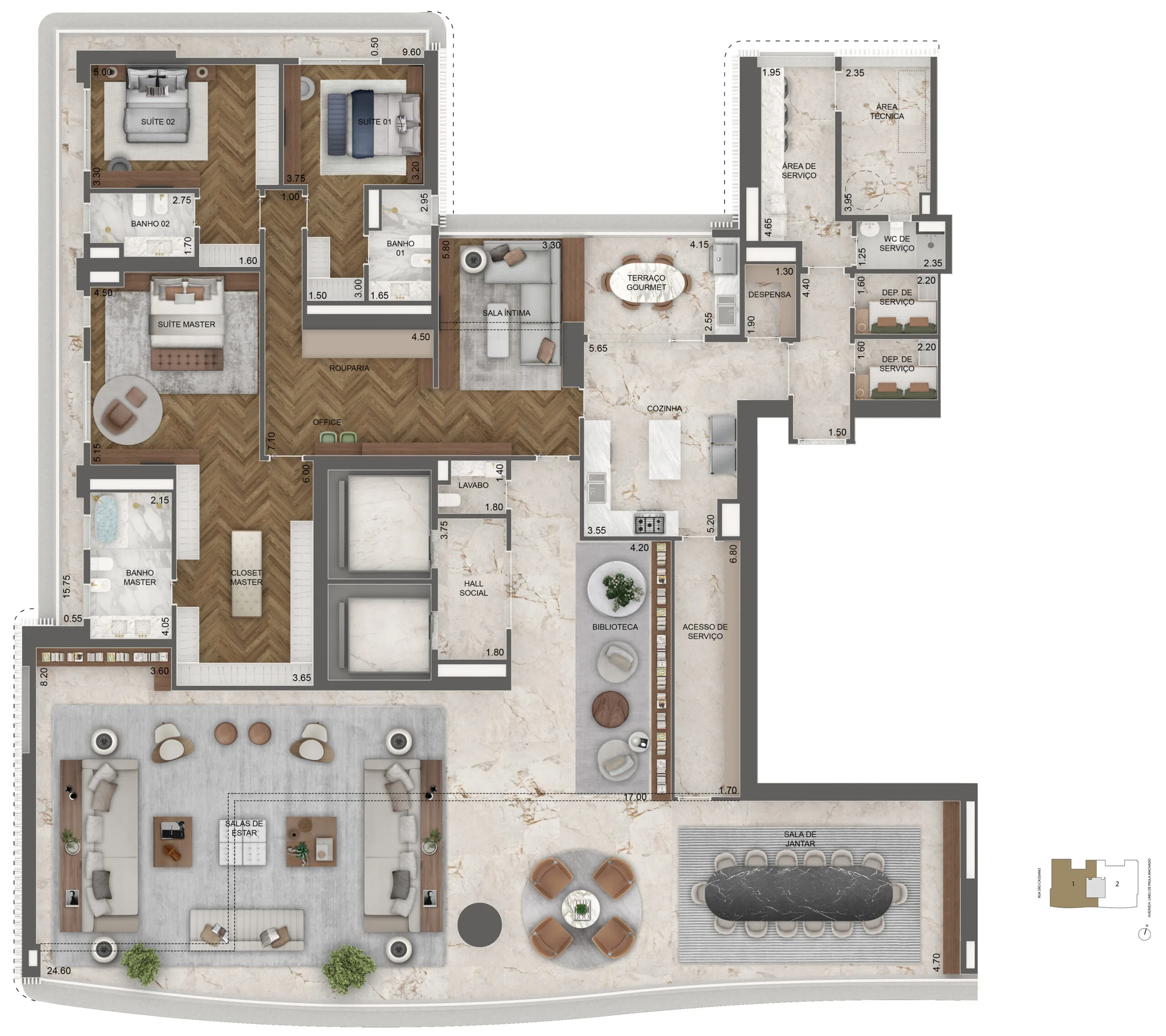 As residências oferecem metragens amplas que variam de 465 m² a 884 m², com quatro suítes e quatro a seis vagas de garagem, em plantas que privilegiam amplitude, conforto e privacidade. Um lançamento residencial que traduz o máximo do design italiano e do morar de alto padrão em São Paulo.