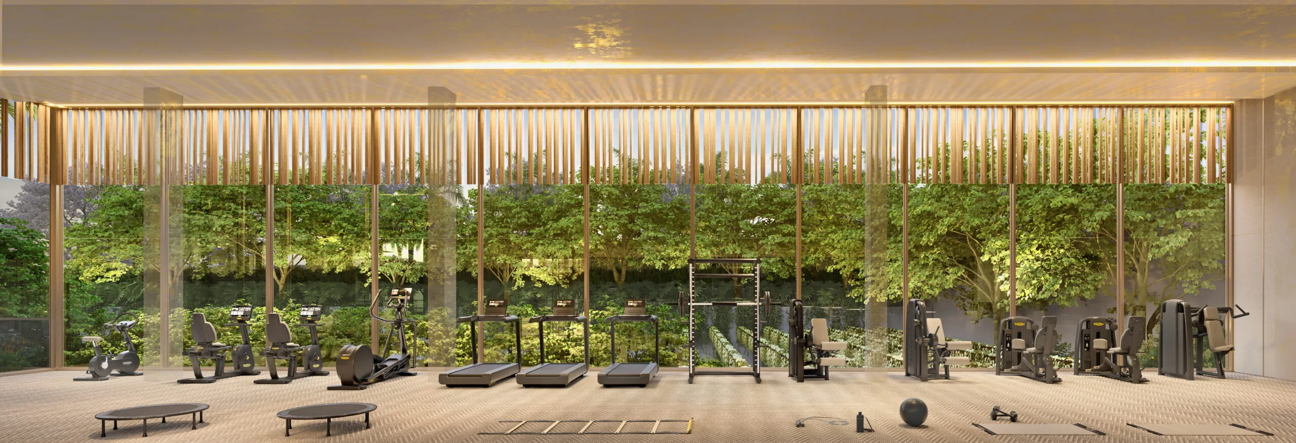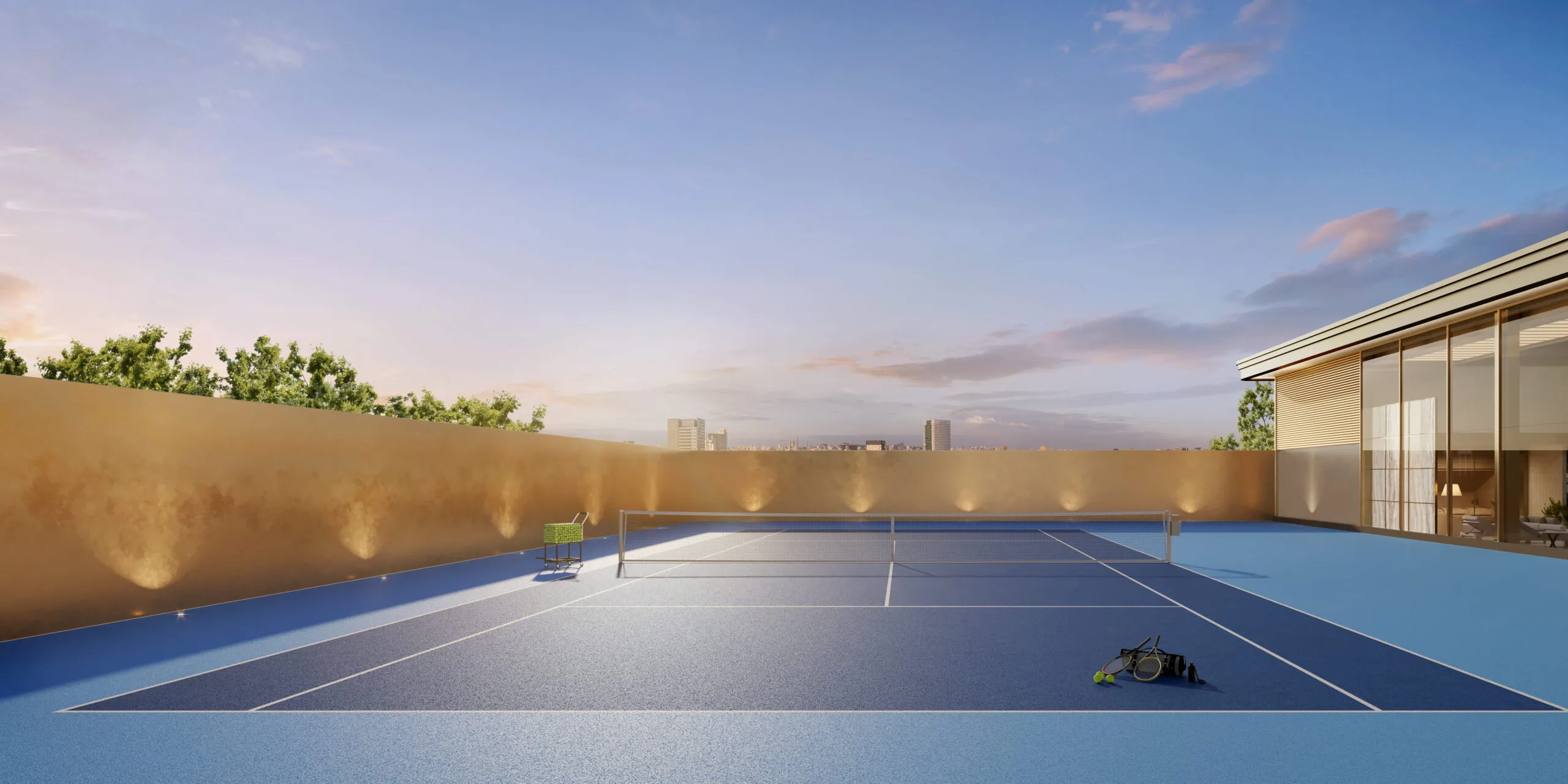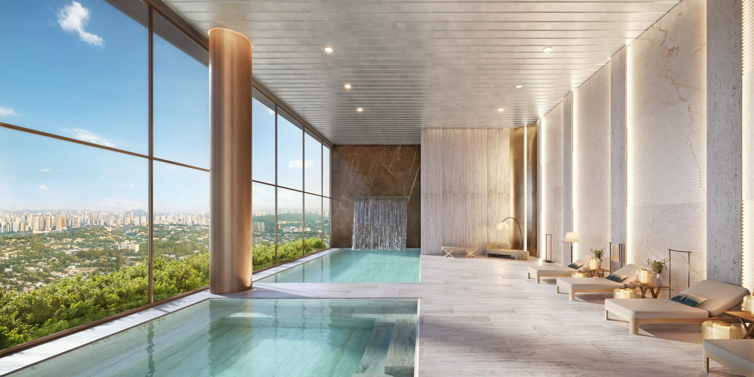 As áreas comuns, inteiramente mobiliadas pela Armani/Casa, foram concebidas como verdadeiros refúgios urbanos, com spa, saunas, piscinas, espaço yoga, beauty space, brinquedoteca, playground e quadra de tênis oficial. No 44º andar, uma área wellness imponente reúne piscina coberta com raia olímpica, jacuzzi, sauna seca, academia suspensa e lounges panorâmicos, em meio a vistas deslumbrantes do verde preservado da cidade.