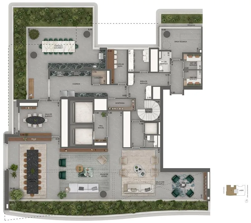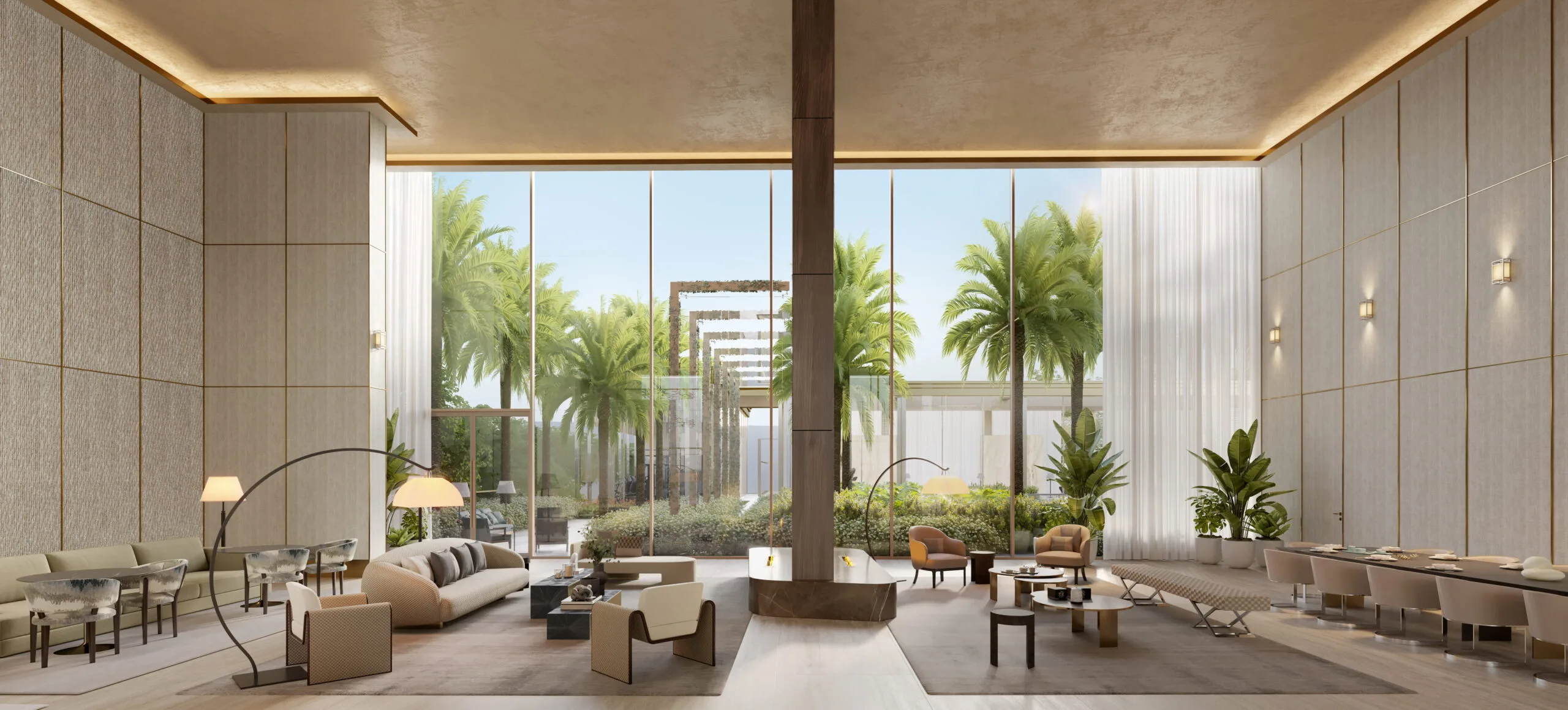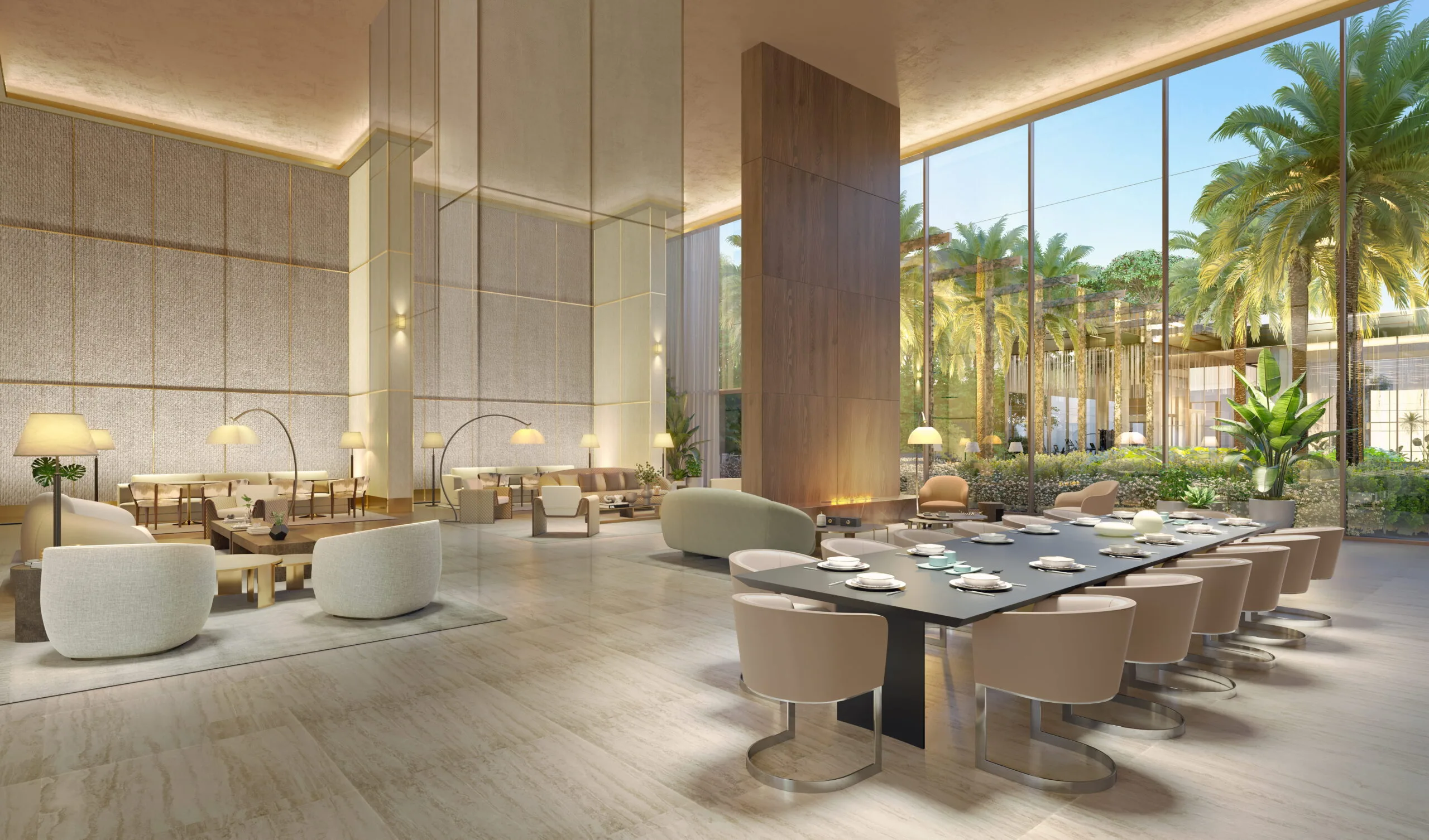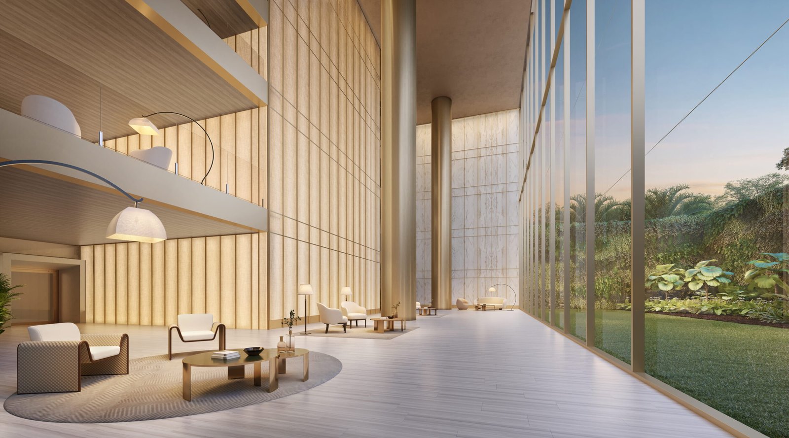 As áreas comuns, inteiramente mobiliadas pela Armani/Casa, foram concebidas como verdadeiros refúgios urbanos, com spa, saunas, piscinas, espaço yoga, beauty space, brinquedoteca, playground e quadra de tênis oficial. No 44º andar, uma área wellness imponente reúne piscina coberta com raia olímpica, jacuzzi, sauna seca, academia suspensa e lounges panorâmicos, em meio a vistas deslumbrantes do verde preservado da cidade.